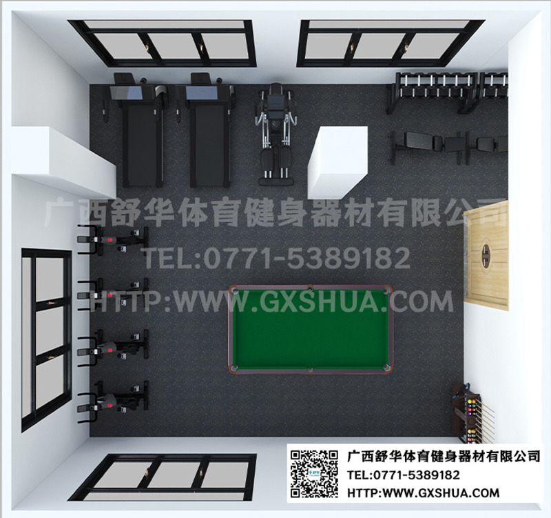 6.台球桌*1张-单位健身房配置台球桌,为员工的业余生活增添了乐趣和选择。与传统的健身器材锻炼相比,台球具有更强的娱乐性和趣味性,能够吸引更多员工参与到健身活动中来,提高健身房的使用率,让员工在工作之余有更多放松身心的方式。